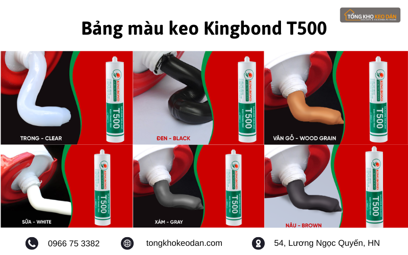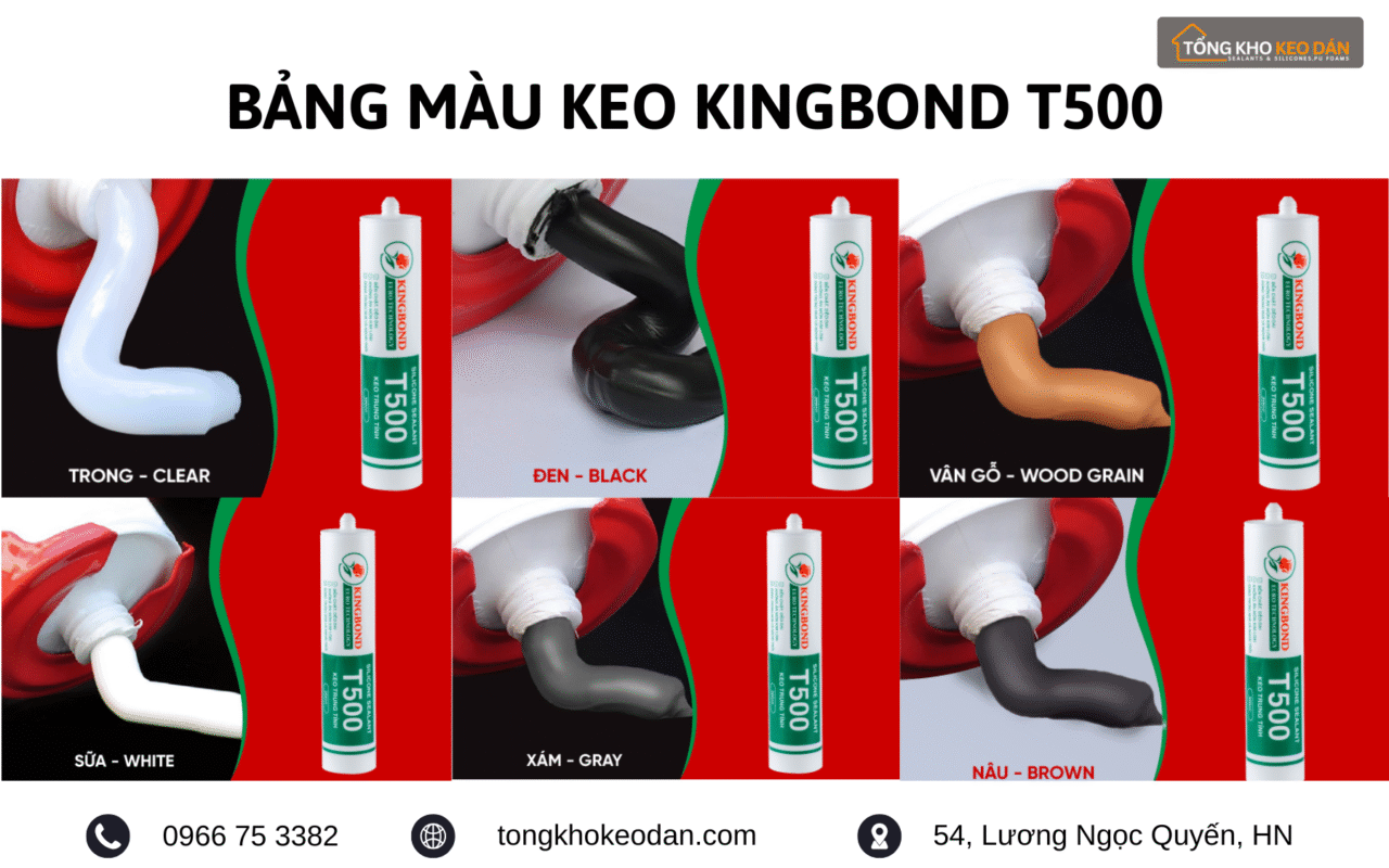 Một trong những ưu điểm nổi bật khiến keo silicone Kingbond T500 được ưa chuộng trên thị trường chính là bảng màu keo Kingbond đa dạng và tinh tế, phù hợp với nhiều phong cách thiết kế và vật liệu khác nhau trong xây dựng.