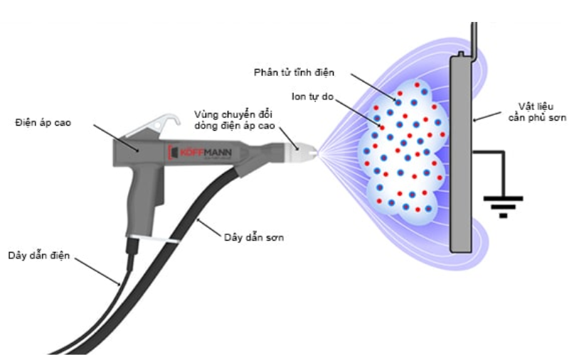 - Phun sơn và hút bám điện: Khi phun, các hạt sơn mang điện dương bay ra khỏi súng sẽ bị hút mạnh về phía bề mặt vật liệu tích điện âm. Nhờ hiện tượng hút tĩnh điện, lớp bột sơn bám đều và chắc chắn lên toàn bộ bề mặt, kể cả các góc khuất.